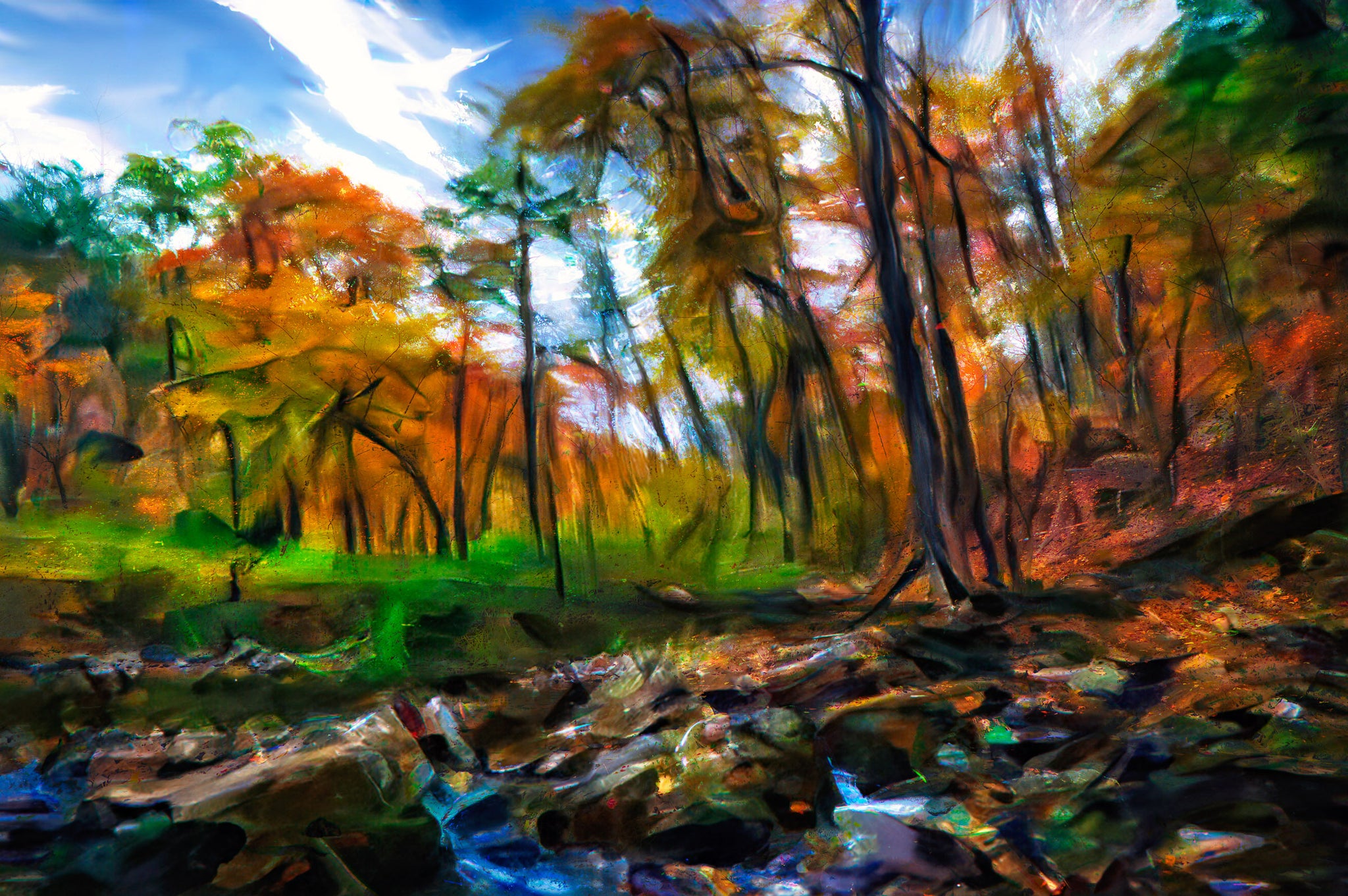 This piece feels like a deep breath in the middle of fall. A winding creek cuts through a forest glowing with amber, gold, and late-season greens—rendered with a dreamy, painterly motion that makes it feel like you’re standing there, listening to water over rocks. The softened edges and rich color create a mood without heaviness: calm, immersive, and quietly dramatic.