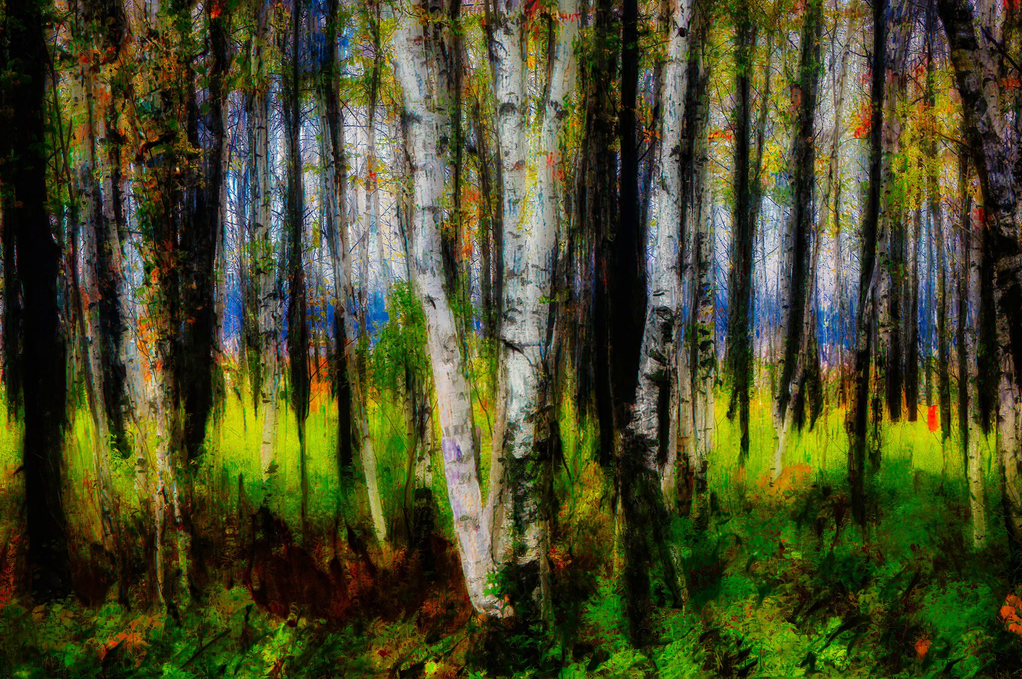 This piece has that rare “stop-you-in-your-tracks” presence—tall birch trunks rising like natural pillars, wrapped in rich autumn color and luminous greens. The painterly texture gives it motion and depth, so it feels less like a snapshot and more like a memory of being in the woods: layered, immersive, and quietly powerful. It’s calming, but it still has energy—perfect for someone who wants nature on the wall without it feeling predictable.