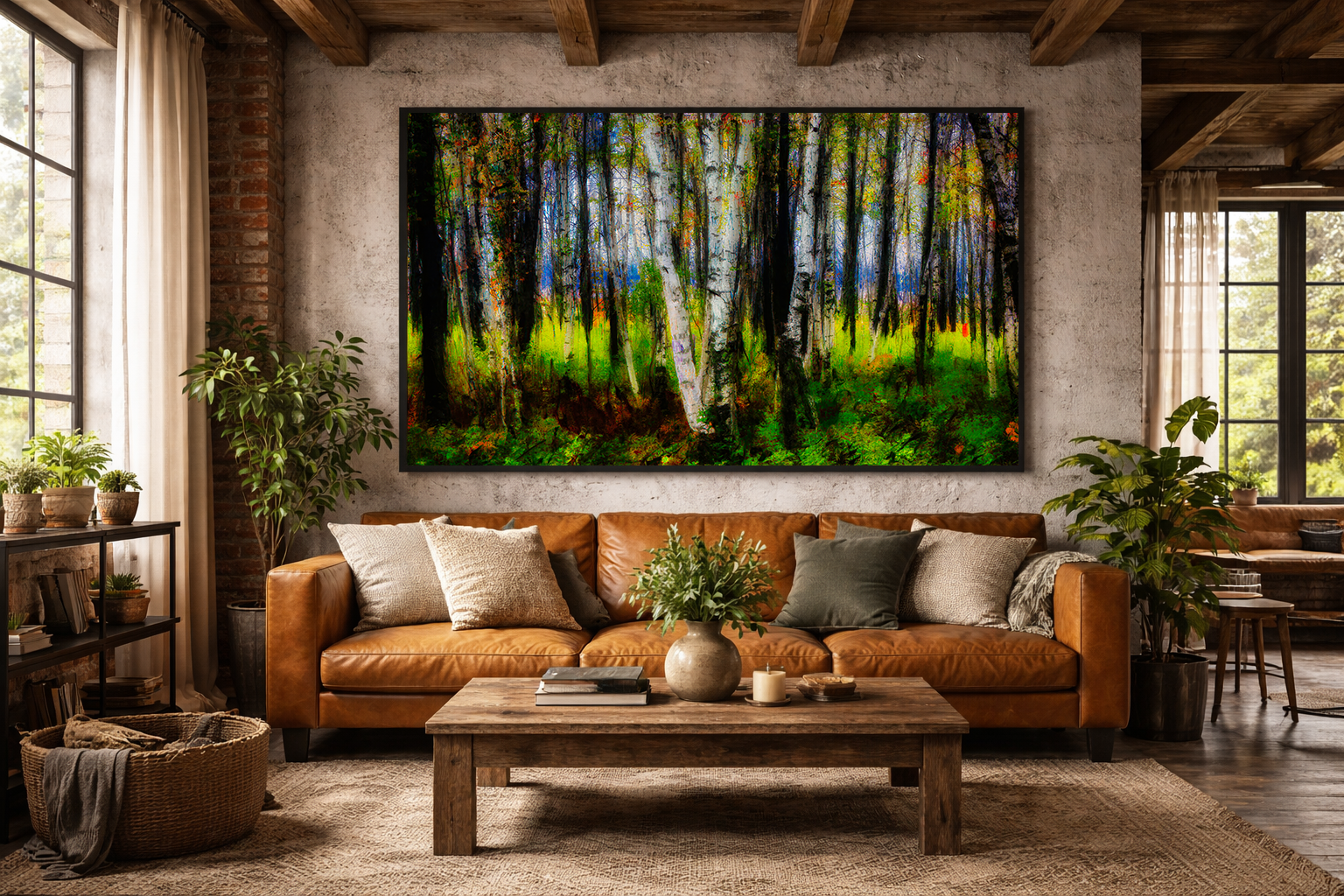In a home or office, this artwork works like a visual reset button. It brings in the grounding feel of the forest and instantly softens a space. It looks especially strong in living rooms, bedrooms, entryways, and offices—anywhere you want a statement that still feels peaceful. The whites and charcoals in the trunks pair beautifully with modern neutrals, while the greens play perfectly with plants, natural wood, stone, linen textures, and warm lighting. If your space leans contemporary, this adds organic contrast; if it's rustic or cabin-inspired, it completes the vibe.