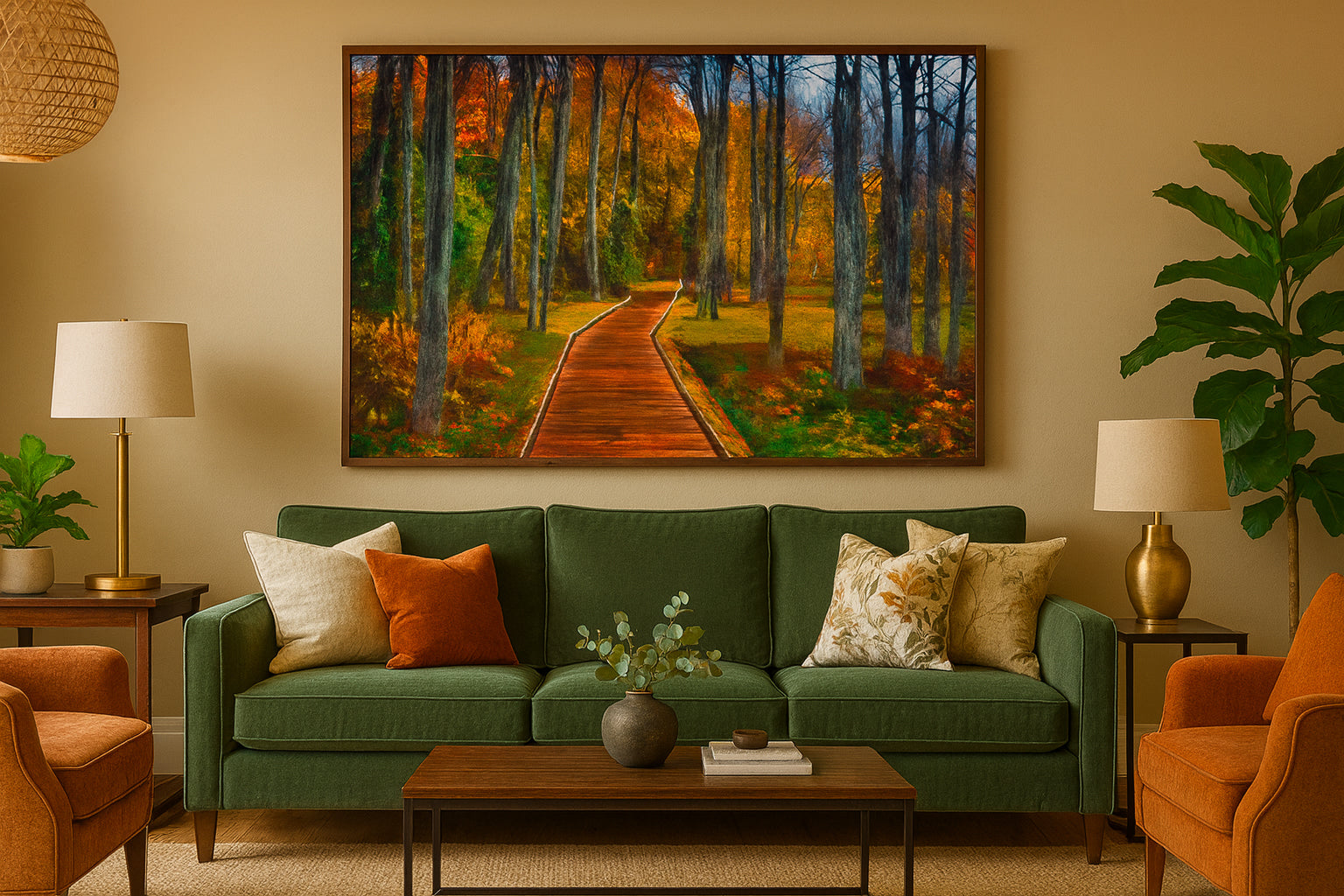 If you want artwork that brings warmth, peace, and a sense of journey into your home, this one does it effortlessly. It’s perfect for living rooms, bedrooms, entryways, offices, and wellness spaces—anywhere you want a grounded, restorative vibe. The rich wood tones of the boardwalk pair naturally with oak, walnut, leather, and warm neutrals, while the greens and golds complement plants and earth-toned décor. In a modern space it adds organic softness; in a cabin or rustic-modern home it feels right at home.