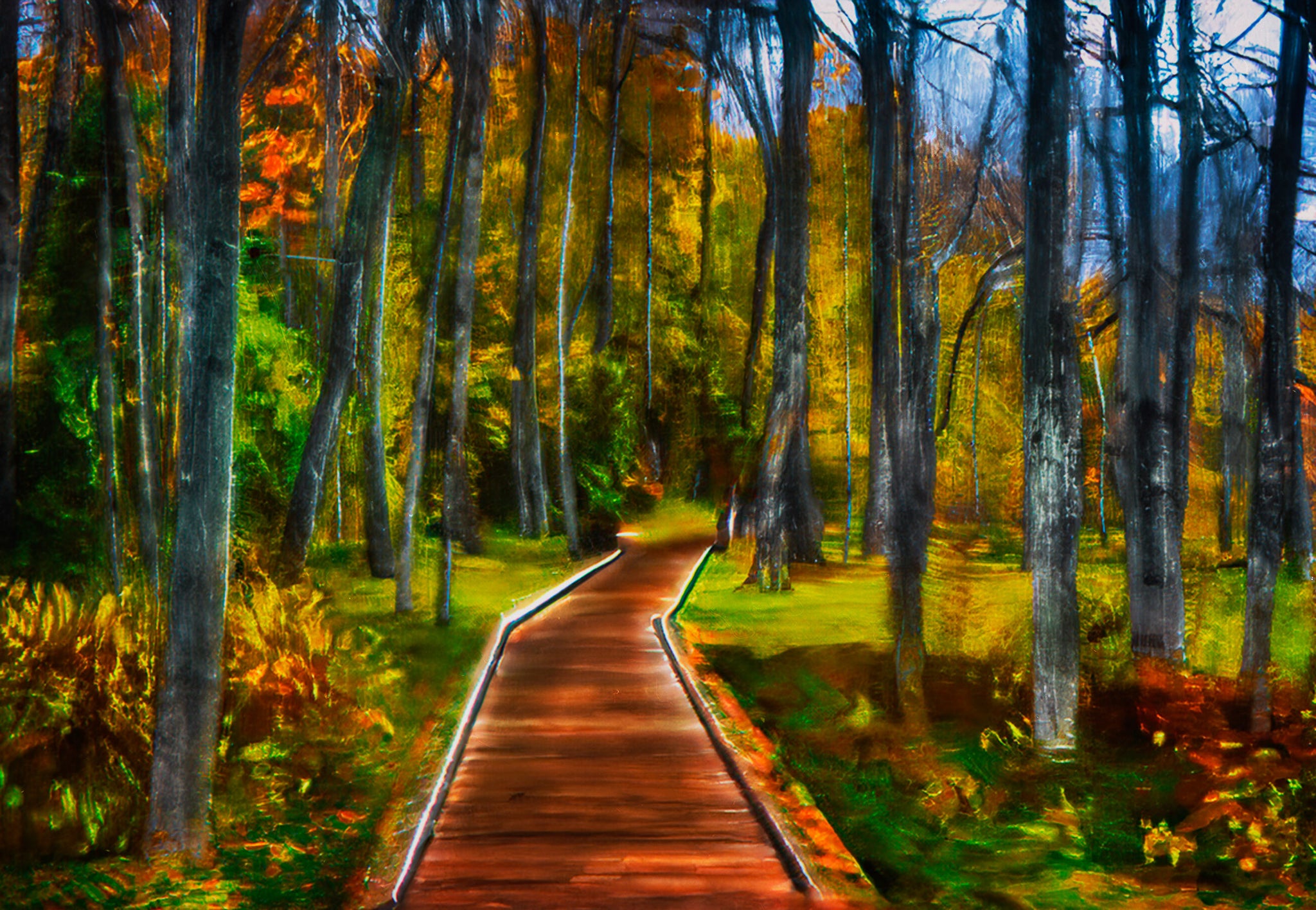 This image feels like an invitation to exhale. A winding boardwalk pulls you straight into a glowing forest of fall color—gold, green, and ember-orange—rendered with a dreamy, painterly motion that makes the scene feel alive. The leading lines are strong and calming at the same time, giving the piece a natural sense of depth and “walk-into-it” presence that works beautifully as a focal point.