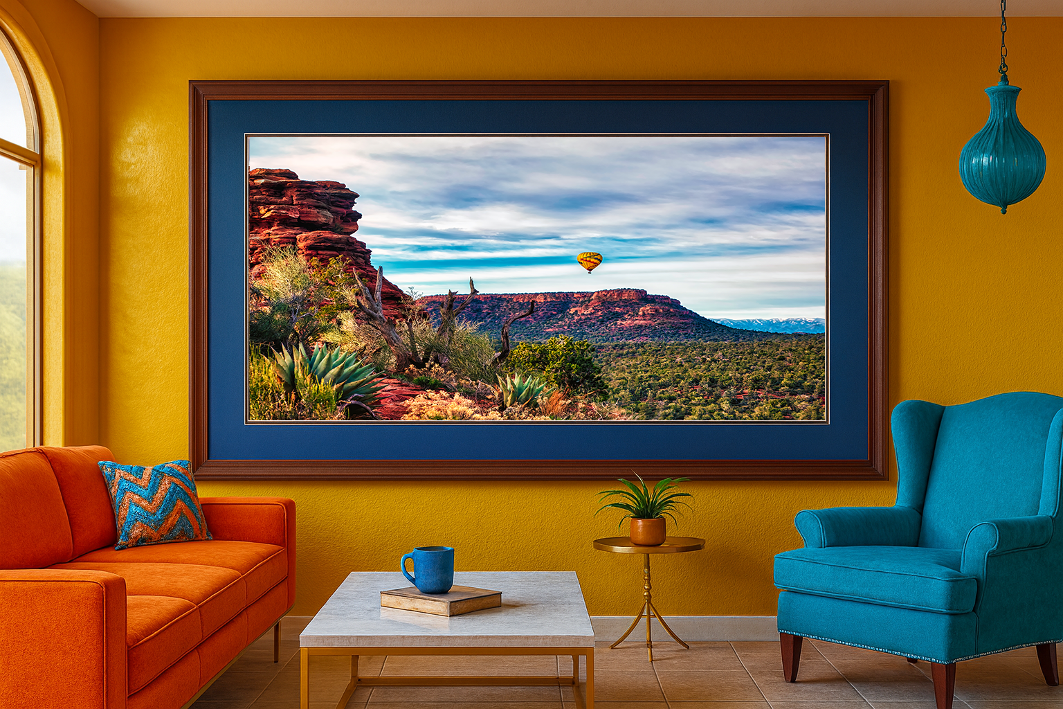 A hot air balloon drifting above Sedona turns this red-rock horizon into a moment of pure lift-off—calm, colorful, and quietly adventurous. The warm sunrise tones paired with dramatic desert textures make this piece an instant focal point, whether you’re styling a modern living room, a southwest-inspired entryway, or a bright home office that needs energy without feeling loud.