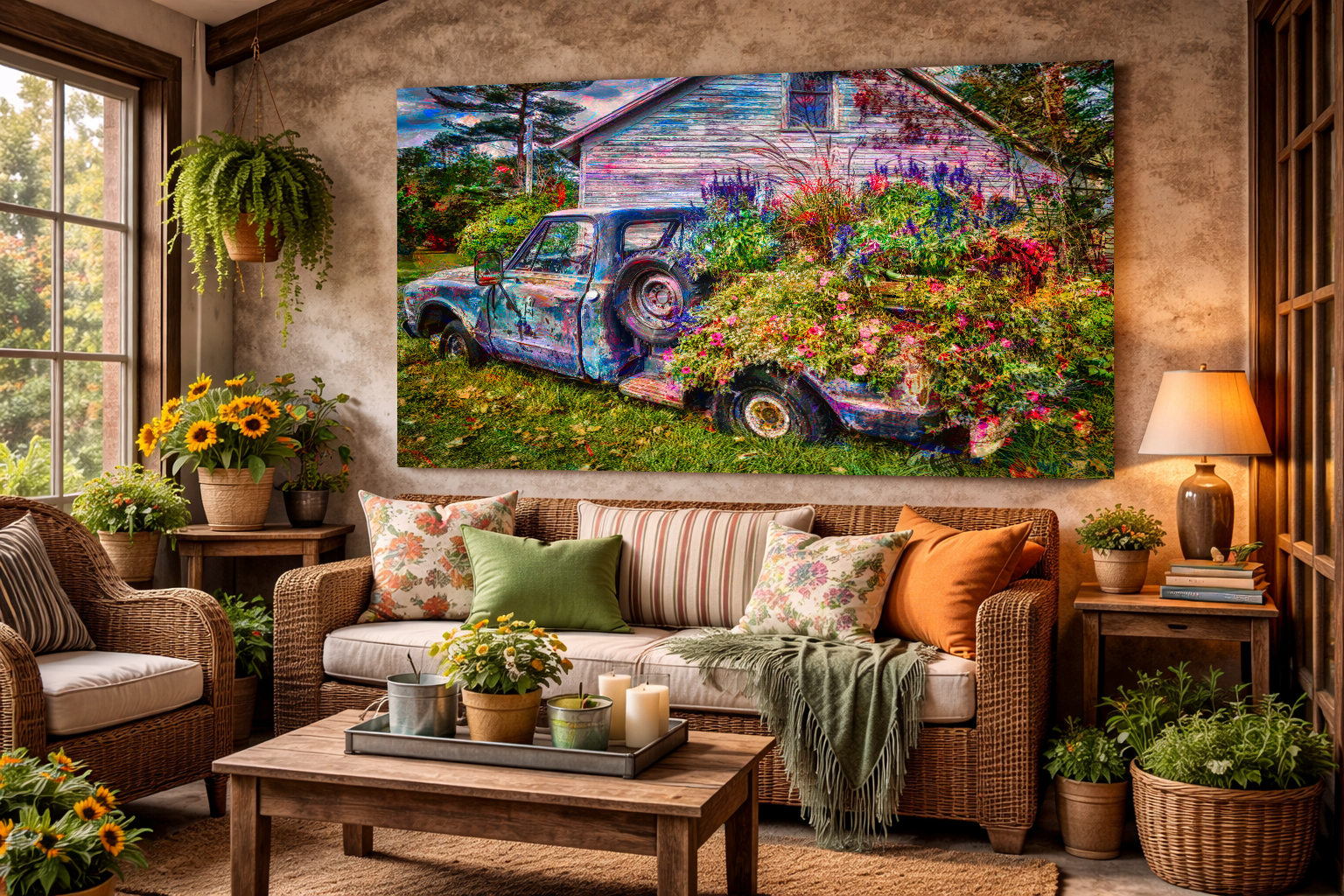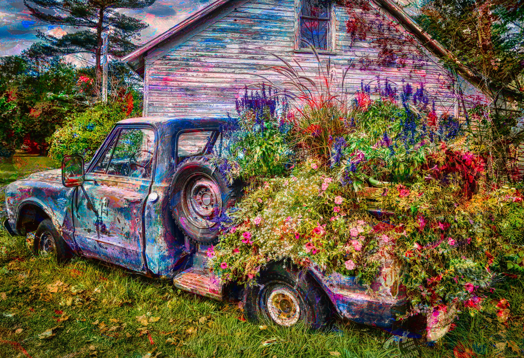 Rustic roots, contemporary edge: The vintage truck and farmhouse backdrop give it warmth and nostalgia, while the artistic processing keeps it fresh and gallery-forward.