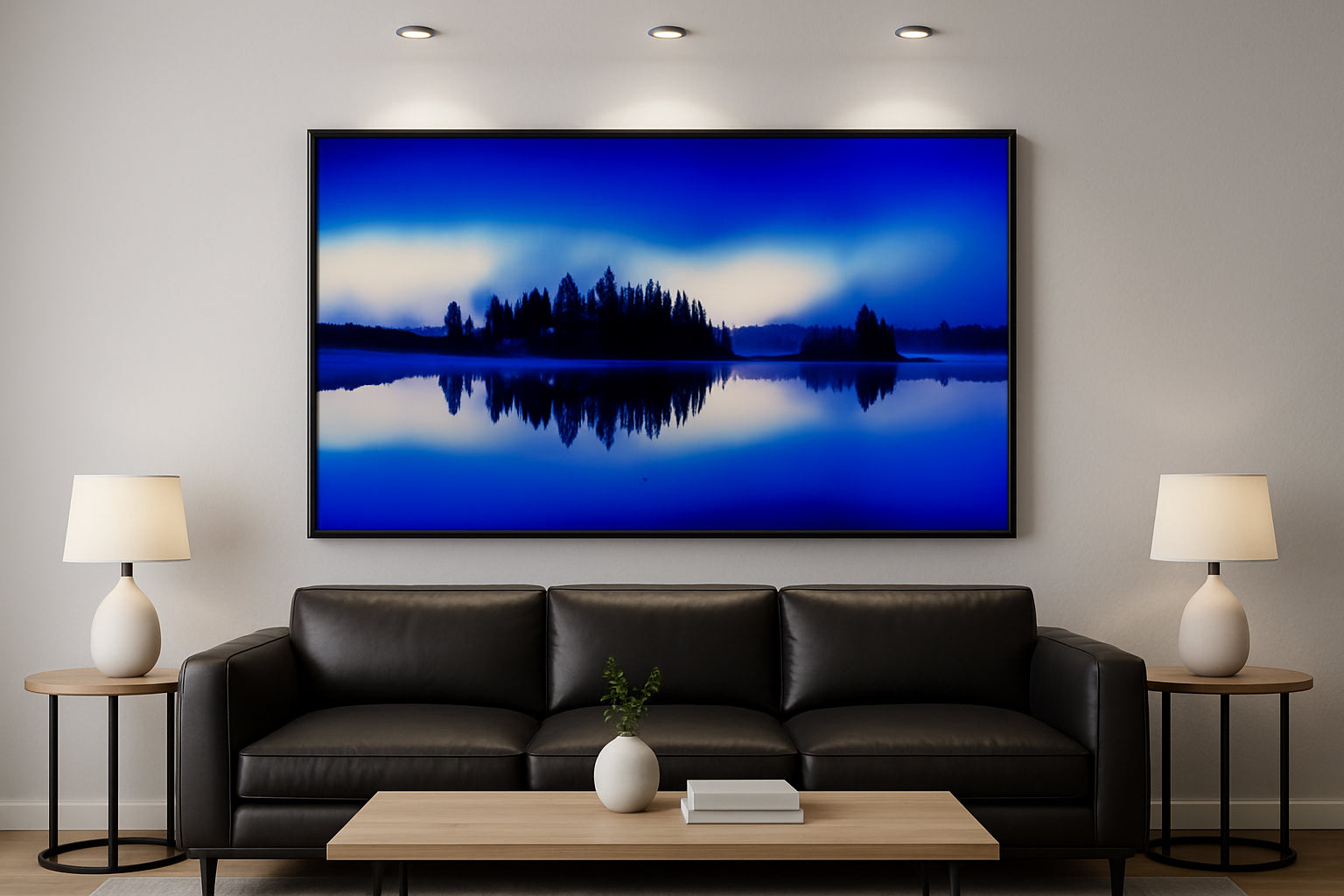 In a home setting, it’s a knockout above a sofa, console table, or bed—especially in spaces styled with clean lines, natural woods, black accents, or cool neutrals. It also looks fantastic in offices, waiting rooms, and lake cabins where you want calm energy and a subtle “wow” factor. Choose metal for maximum luminosity and crisp contrast (those blues will glow), or canvas for a softer, gallery-wrapped finish that feels warm and serene.