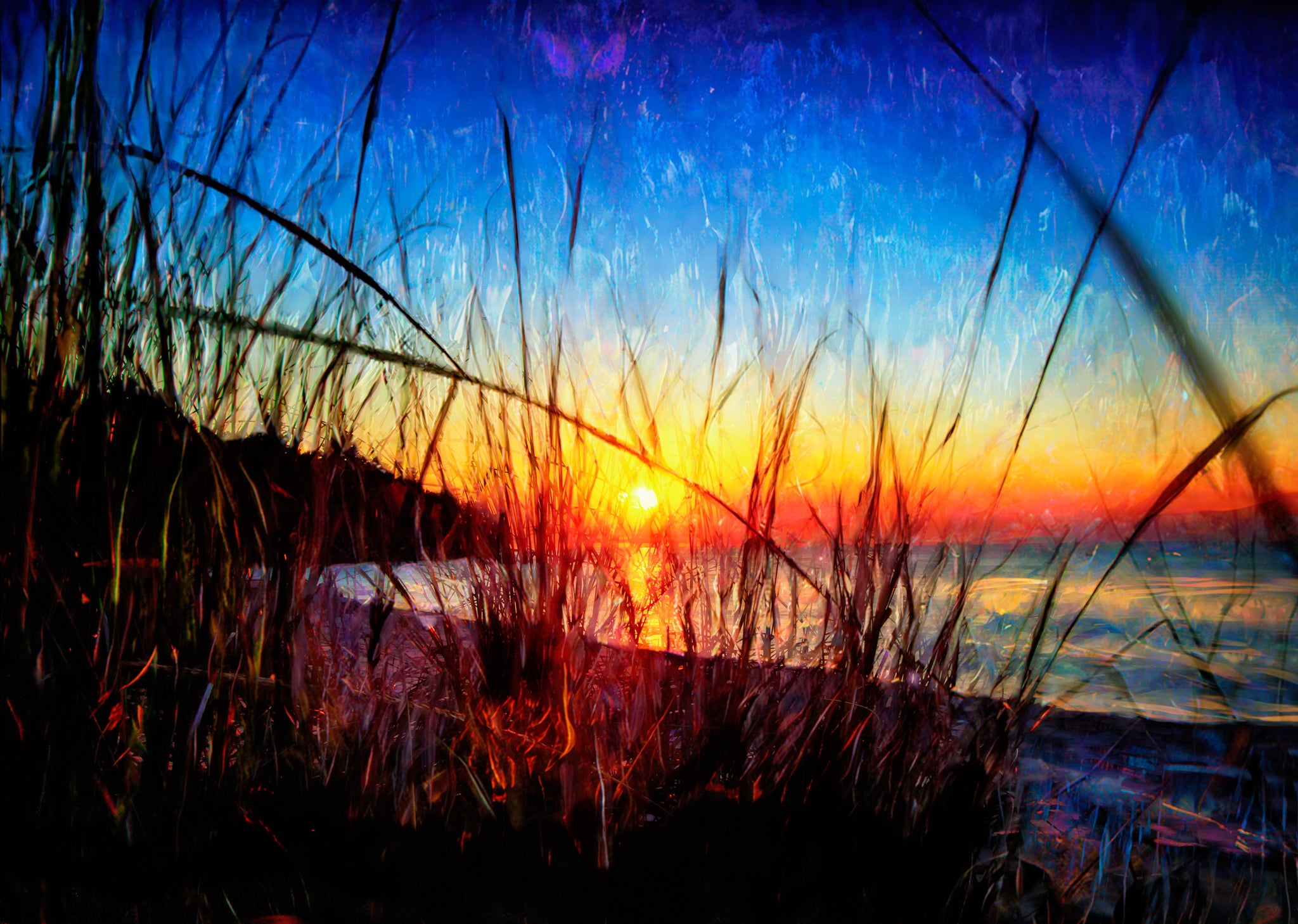 This image captures that rare, quiet moment when the sun drops low and the shoreline turns to glowing color—seen through wild dune grass that adds texture, depth, and a sense of being right there. The painterly light and rich blues-to-amber gradient make it an instant mood-setter: calming, coastal, and quietly dramatic without overwhelming the room.