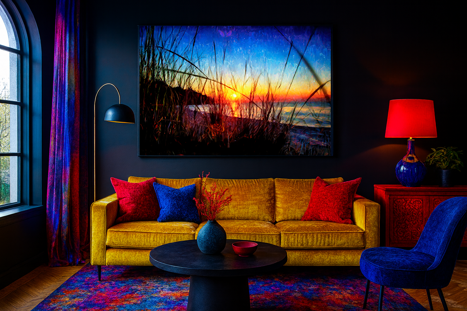 Creates atmosphere fast: warm sunset tones bring comfort; cool blues keep it modern and clean.